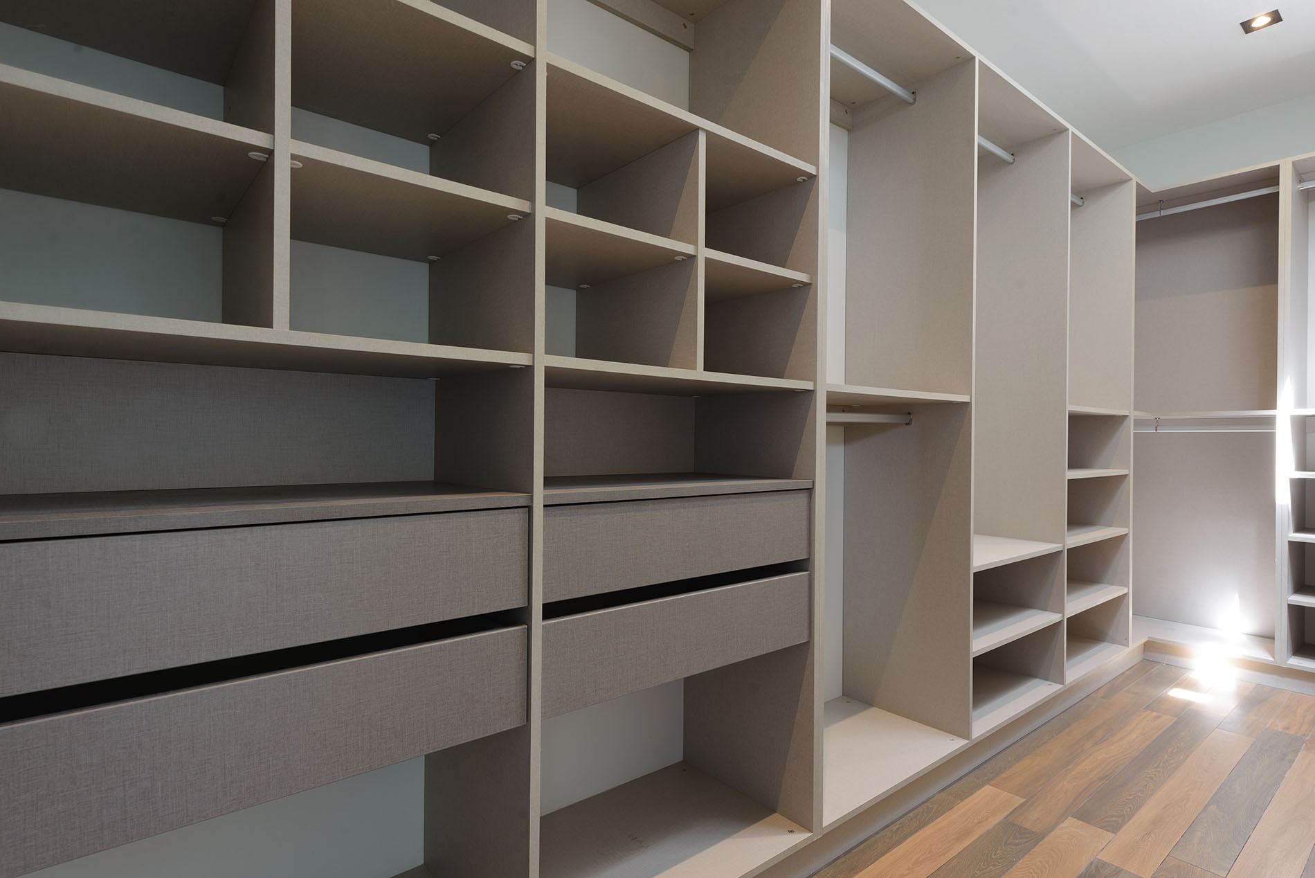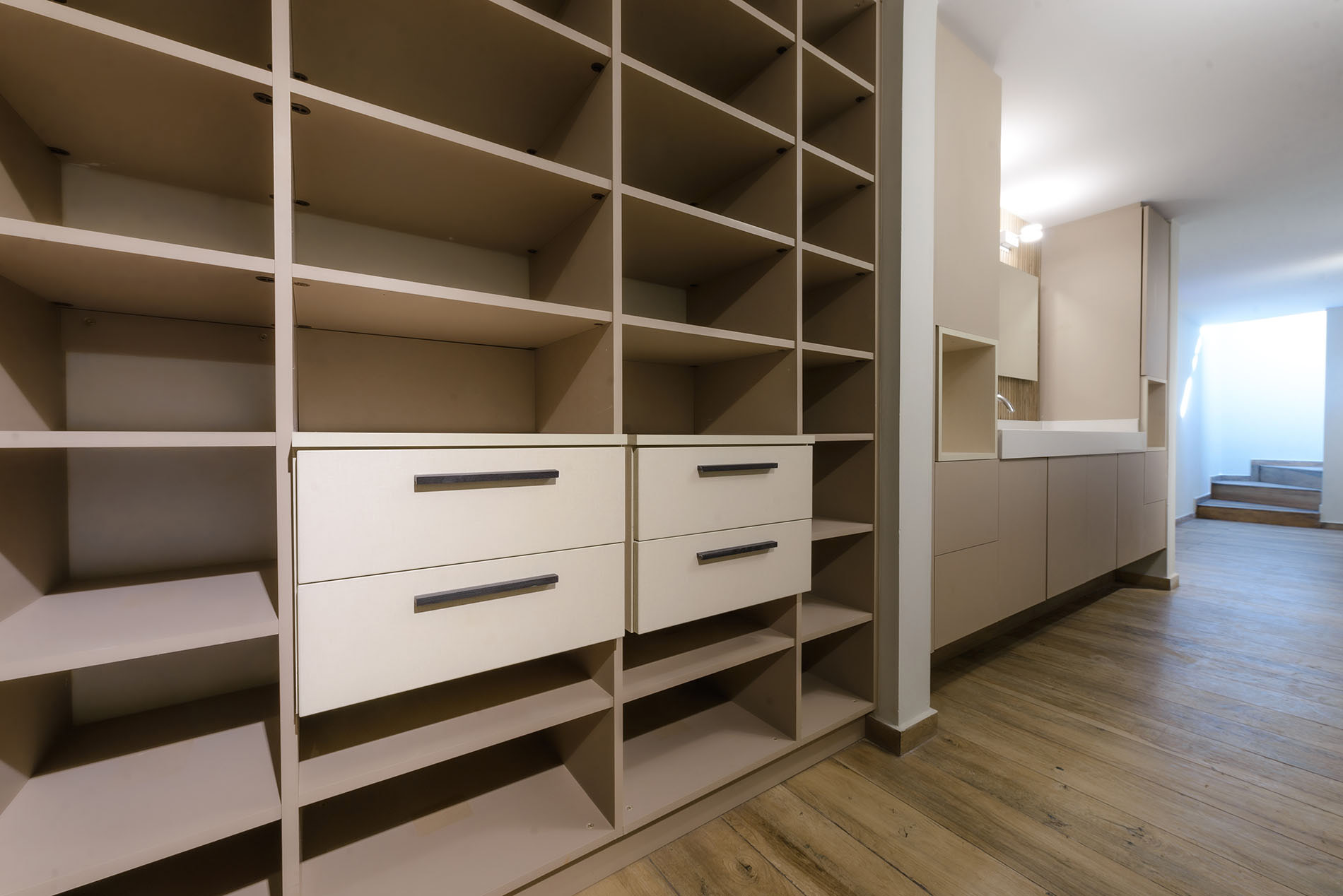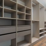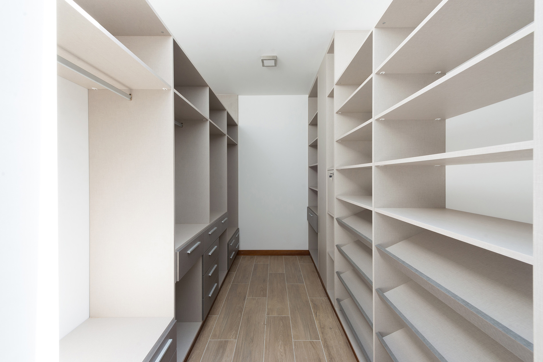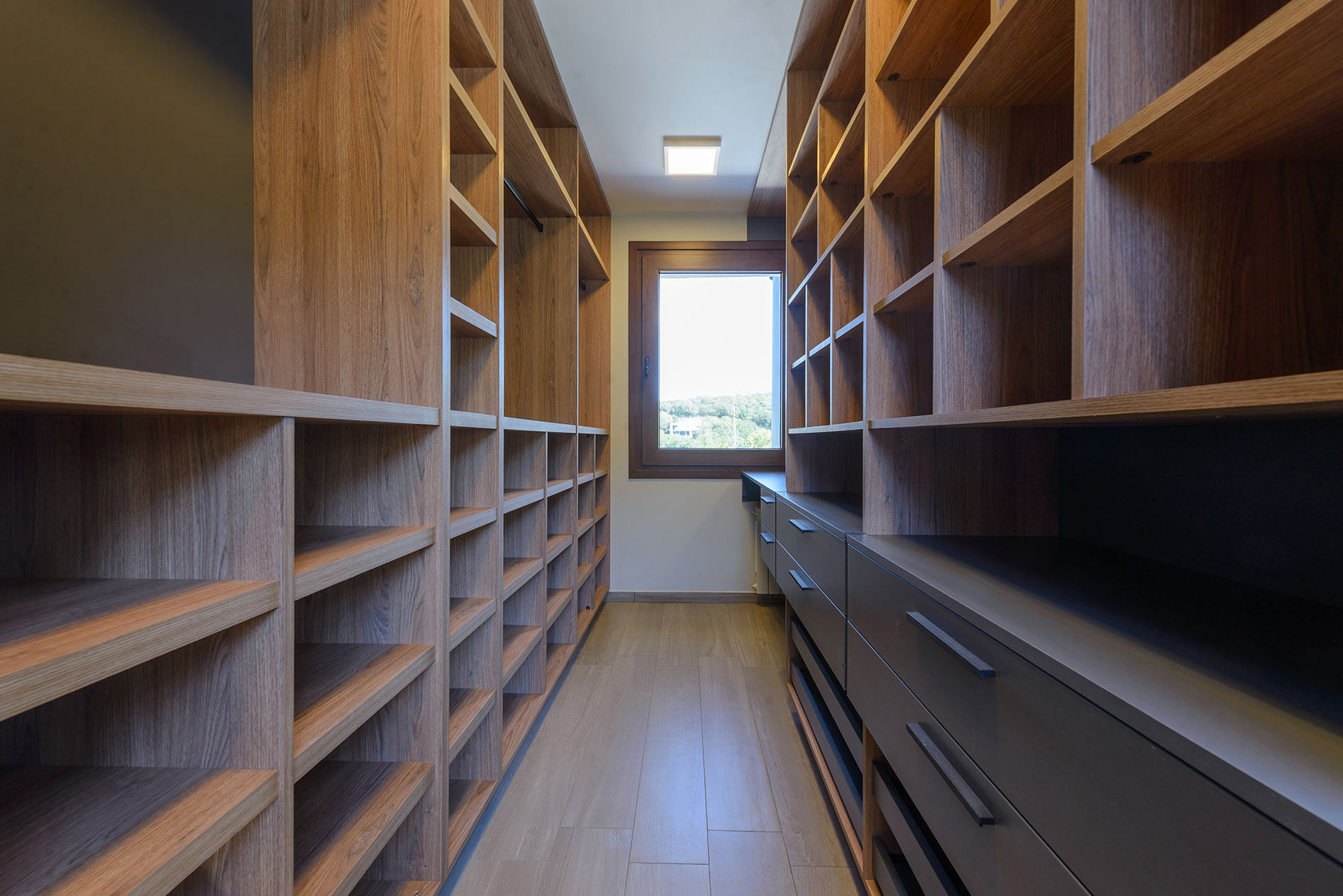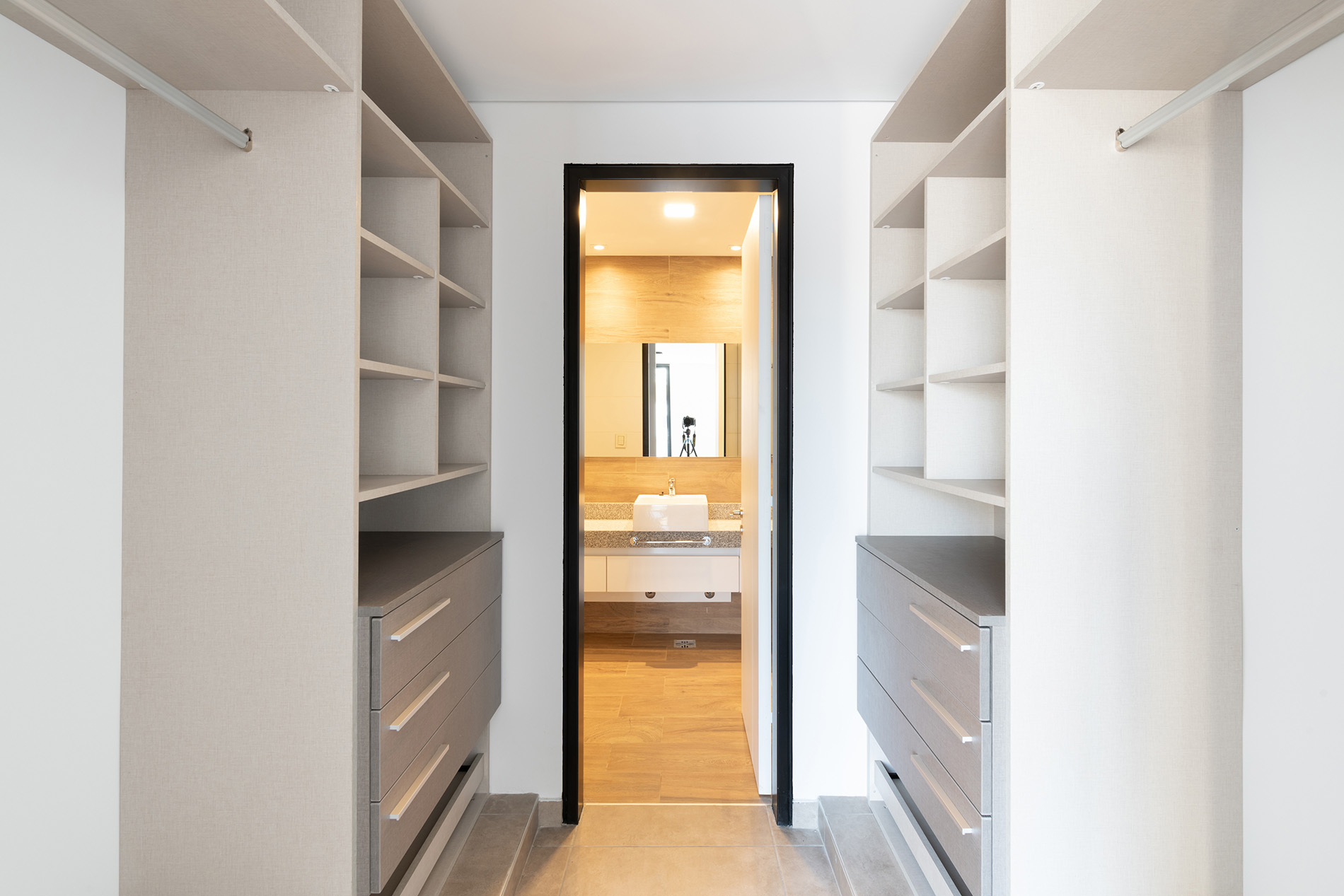 Es estos espacios de guardado abiertos que se ven desde la habitación o baño se resuelven simétricos con los colgados al fondo, estantes más profundos, con espacio para menos prendas, zapateros extraíbles y cajones enormes.
