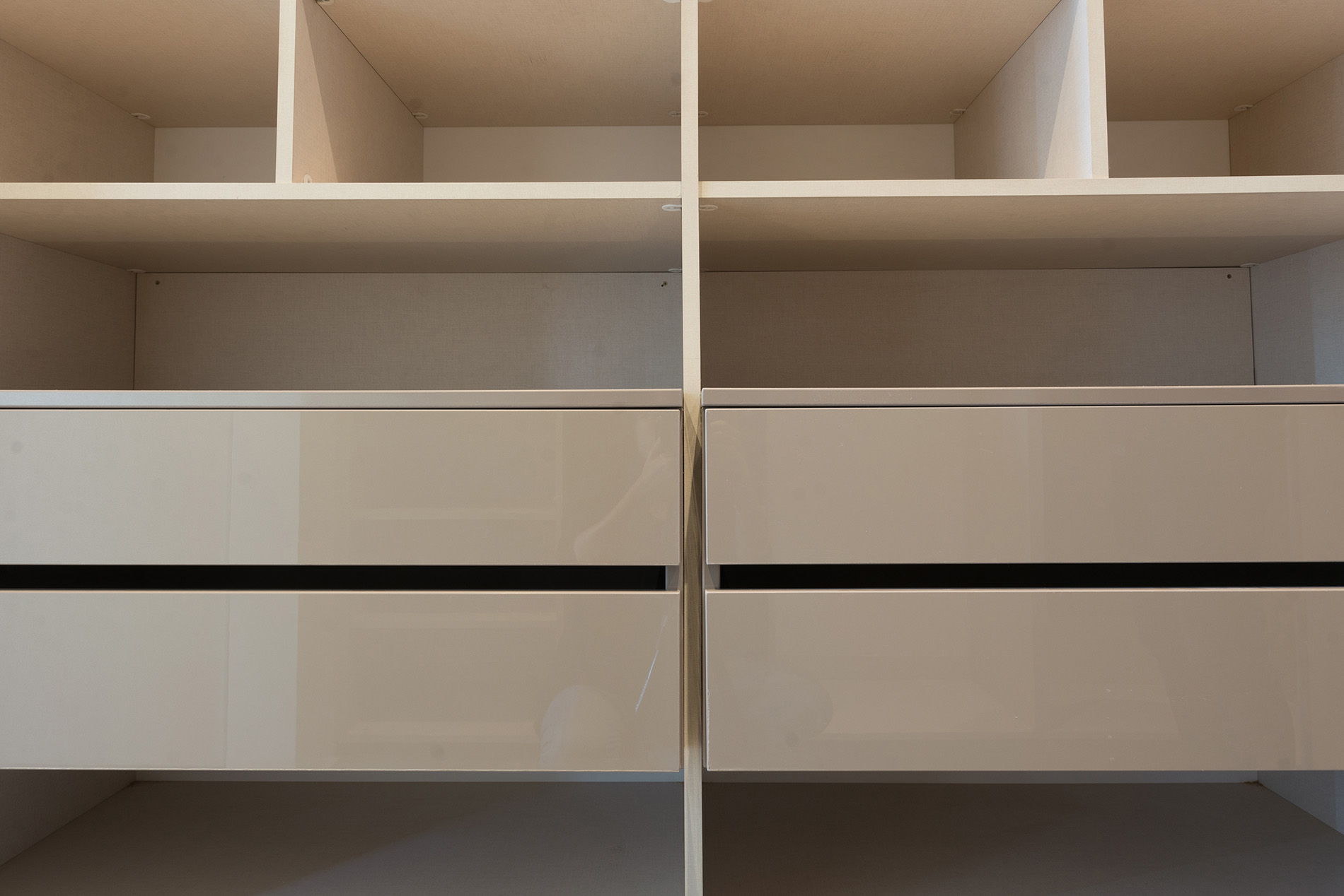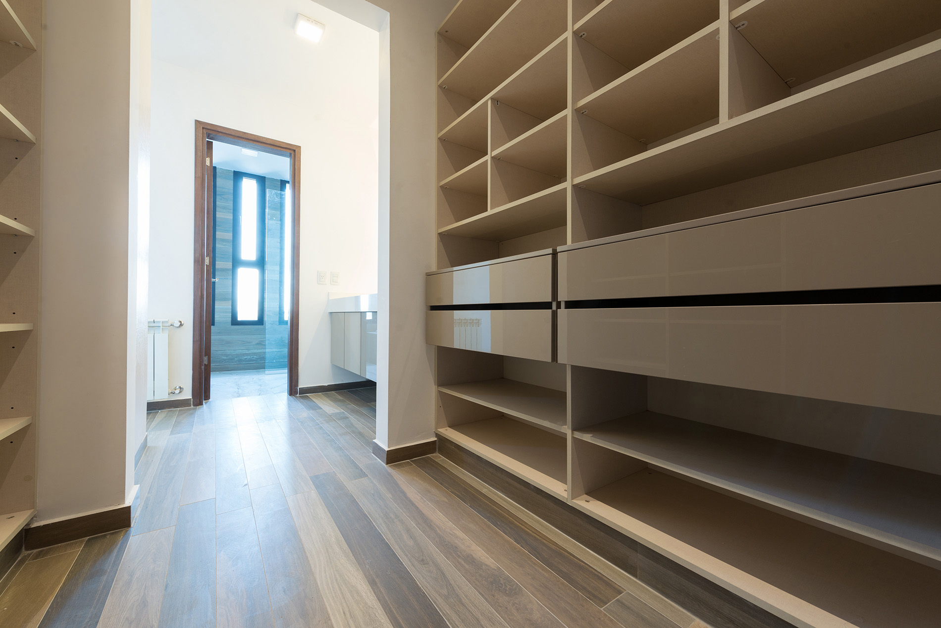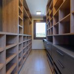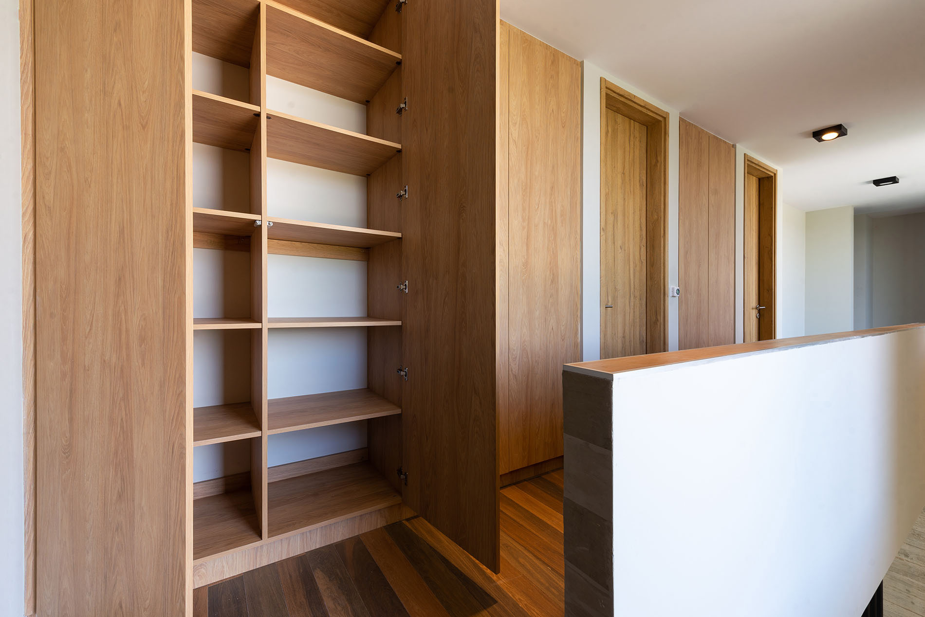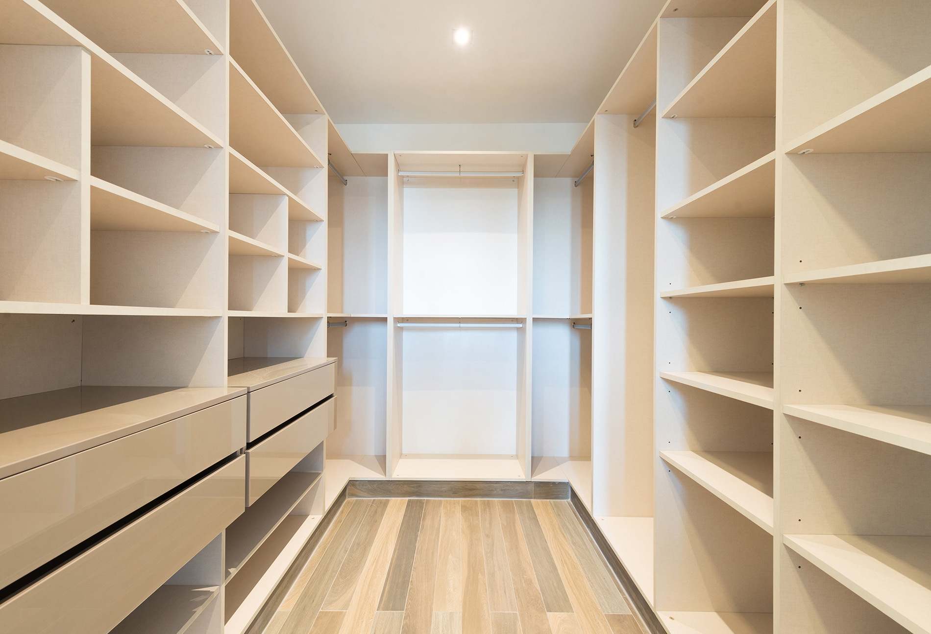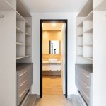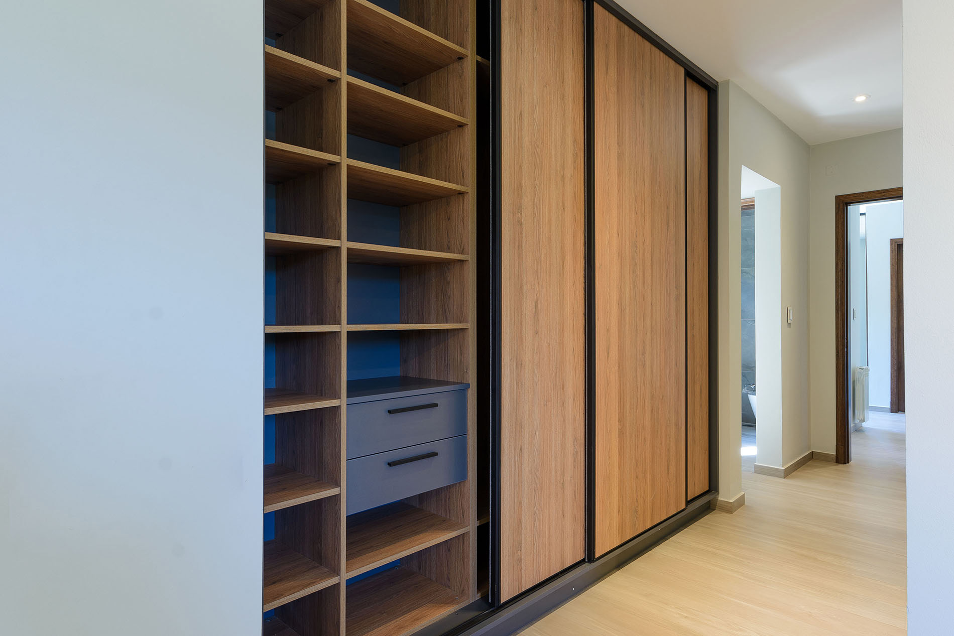 Es estos espacios de guardado abiertos que se ven desde la habitación o baño se resuelven simétricos con los colgados al fondo, estantes más profundos, con espacio para menos prendas, zapateros extraíbles y cajones enormes.