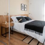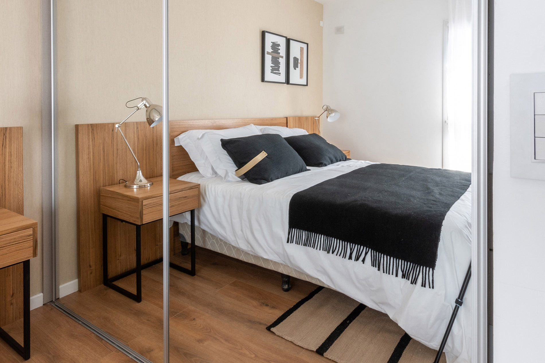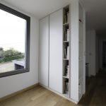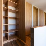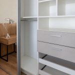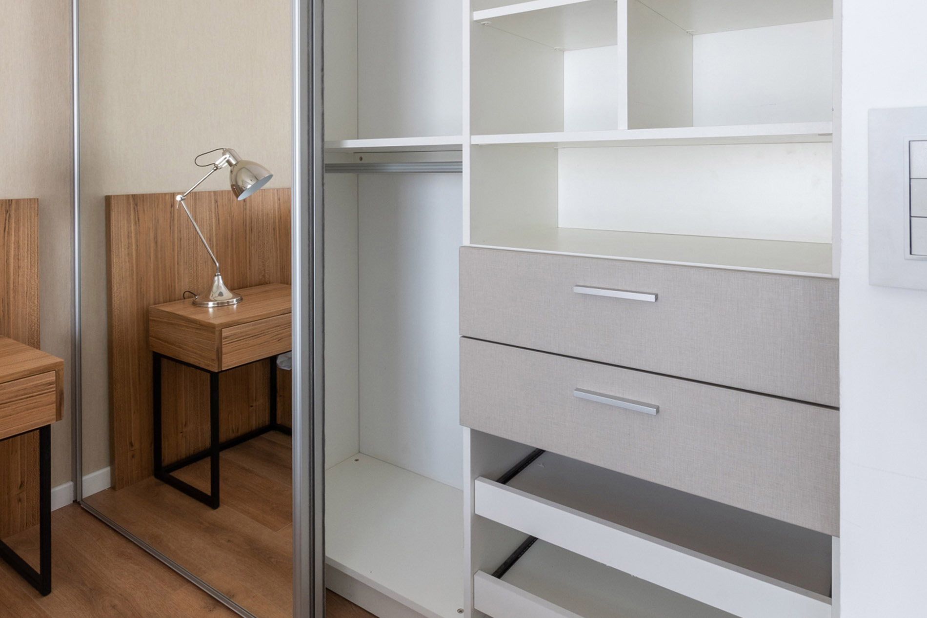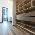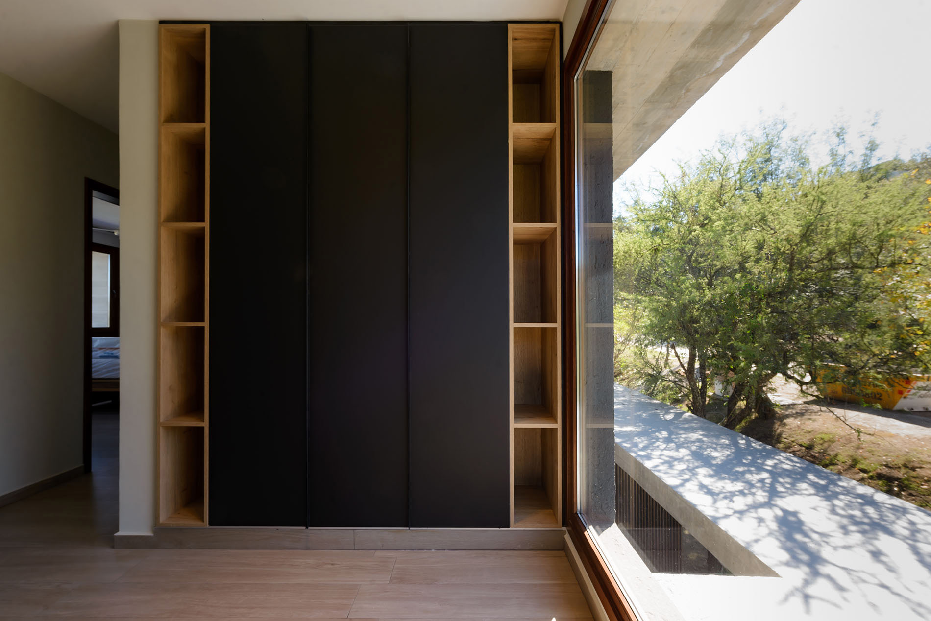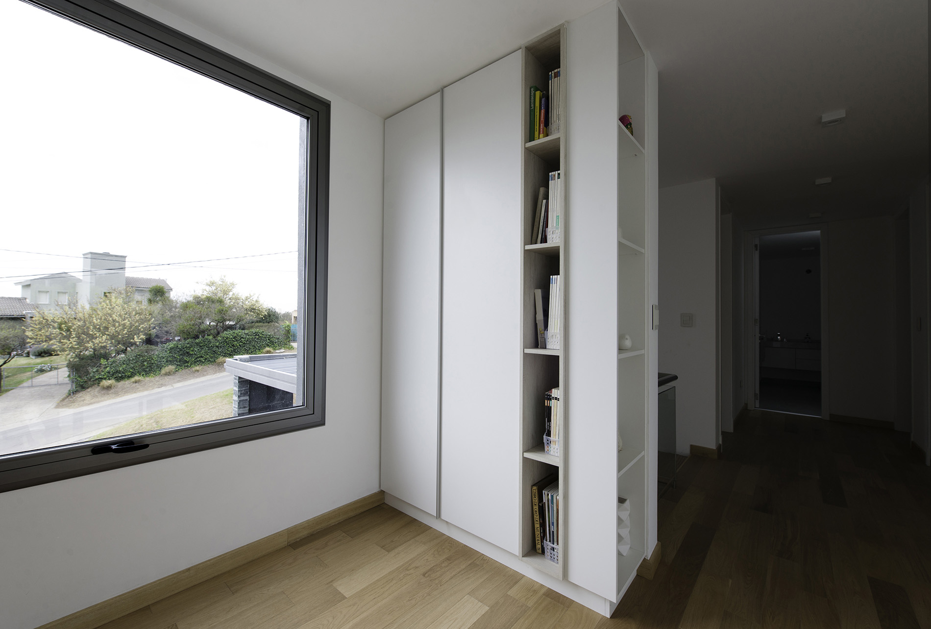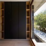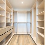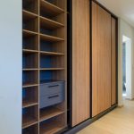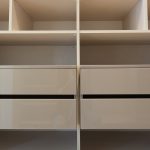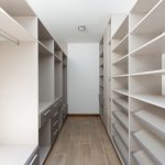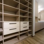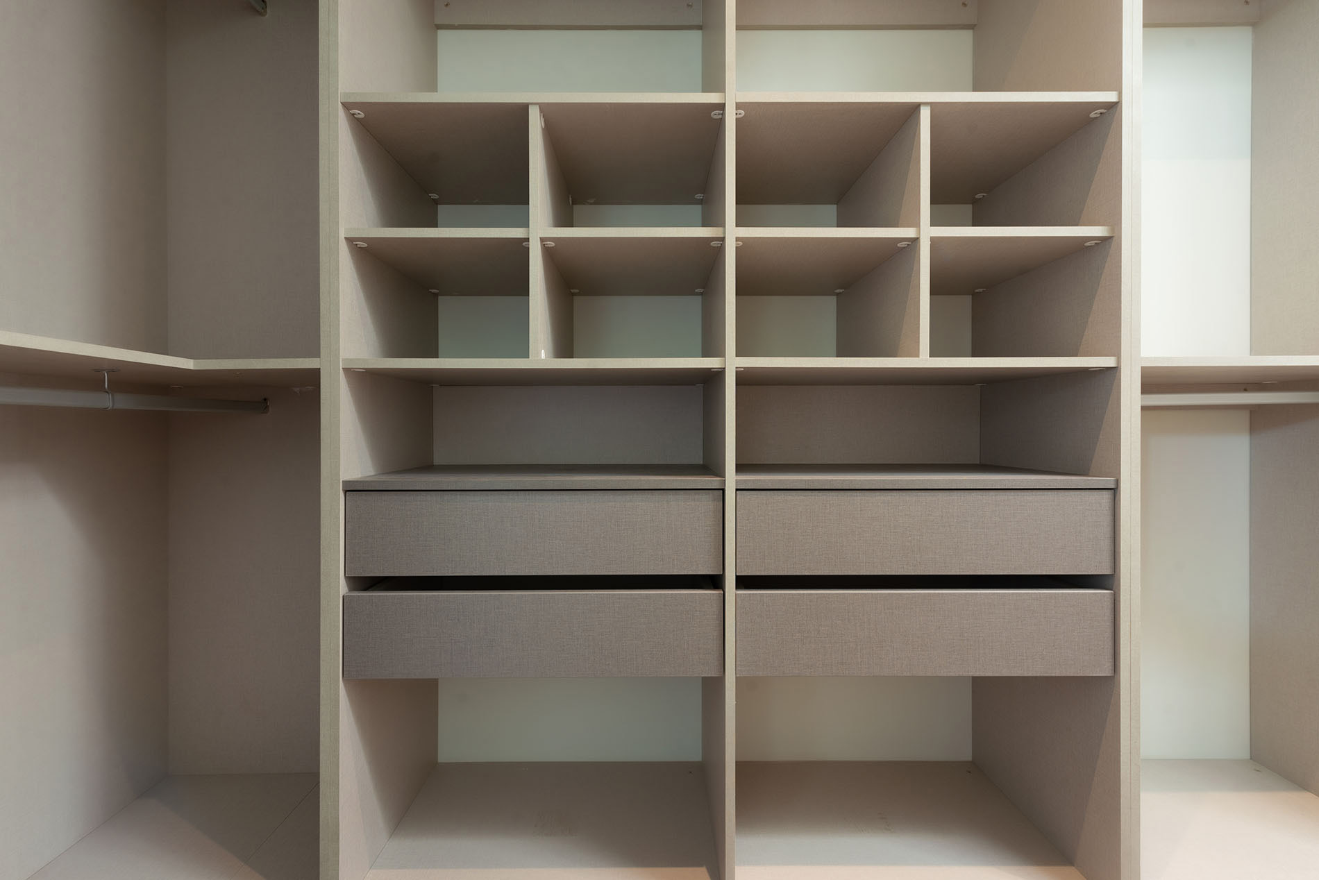 Es estos espacios de guardado abiertos que se ven desde la habitación o baño se resuelven simétricos con los colgados al fondo, estantes más profundos, con espacio para menos prendas, zapateros extraíbles y cajones enormes.
